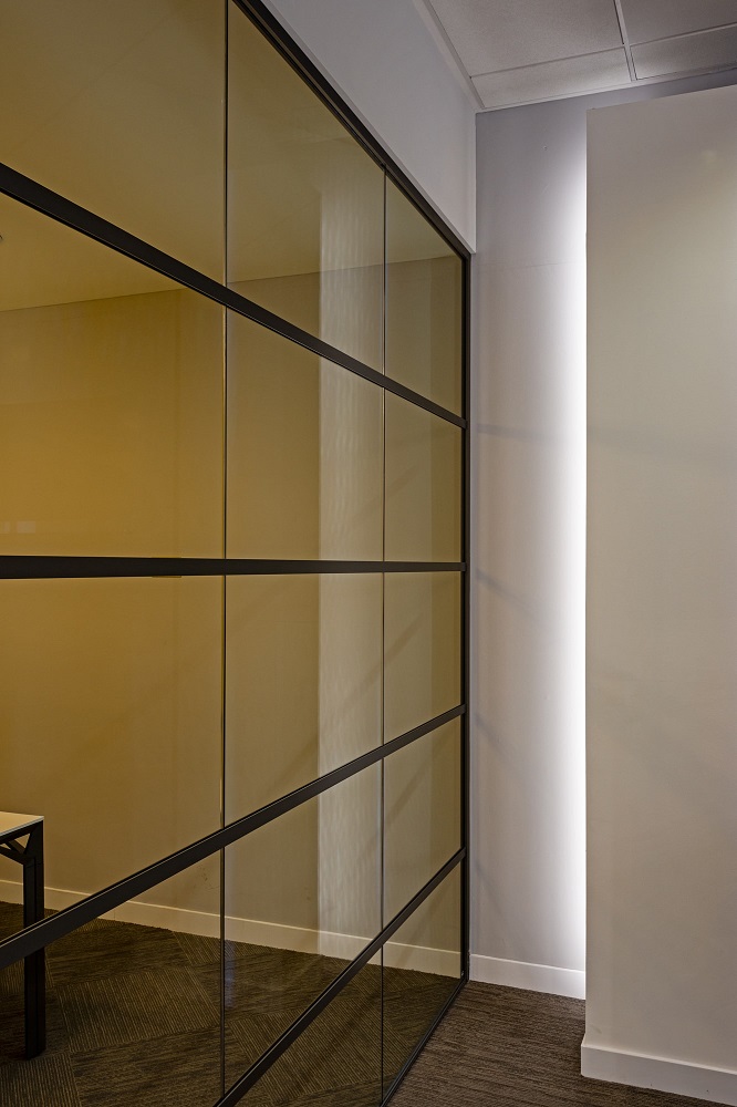 Following in depth discussions with Stewart Stevenson regarding aesthetics vs performance, we mutually agreed to utilise a “new addition” to Komfort’s existing Sonik framed door offering. Komfort’s 70mm picture framed single glazed framed doors were installed on meetings rooms 1 & 2. The Sonik system was chosen to meet the design intent of creating the appearance of a traditional steel framed system with slender sections.
