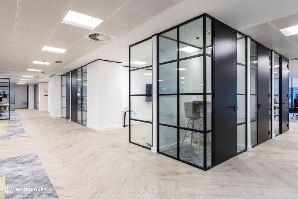The project specification demanded a modern “Crittall-style” finish to separate an open area into a modern, more flexible workspace arrangement that included meeting rooms, quiet areas, wellbeing rooms and hospitality and breakout areas.